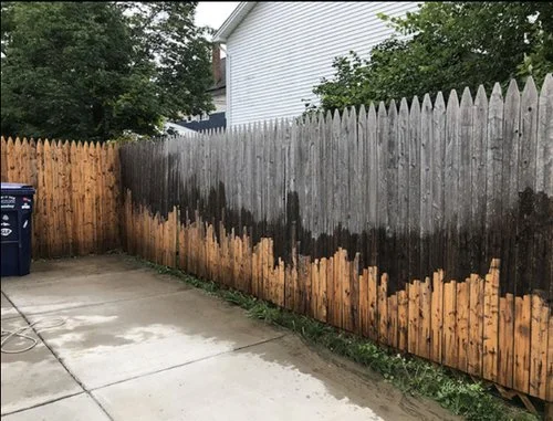 when removing stain from a fence, we have a two-step process! we use a chemical that we spray on the fence that will heat up the stain on the fence To where it will make it easier to remove with a pressure washer, and then we go back with a brightener and brighten The wood up. with our soft wash method!